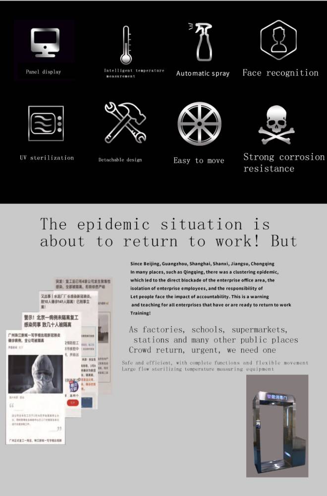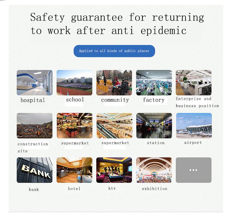 消毒溶液采用食品級(jí),對通過的人員以及物品進(jìn)行非接觸式消毒,同時(shí)可以通過添加人體測溫報(bào)警器和熱成像體溫檢測儀對人員進(jìn)行體溫檢測。