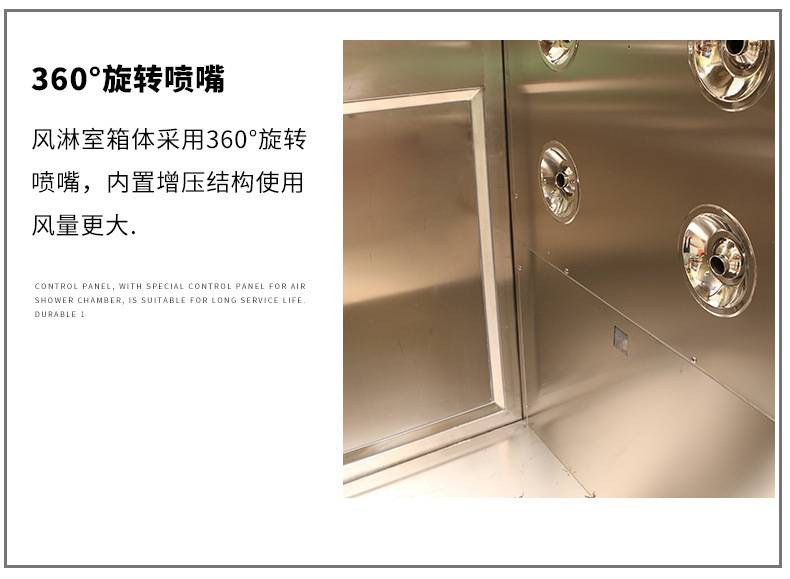 風淋室是一種通用性較強的局部凈化設(shè)備,安裝于潔凈室與非潔凈室之間。當人與貨物要進入潔凈區(qū)時需經(jīng)風淋室吹淋,其吹出的潔凈空氣可去除人與貨物所攜帶的塵埃,能有效的阻斷或減少塵源進入潔凈區(qū)。風淋室/貨淋室的前后兩道門為電子互鎖,又可起到氣閘的作用,阻止未凈化的空氣進入潔凈區(qū)域。